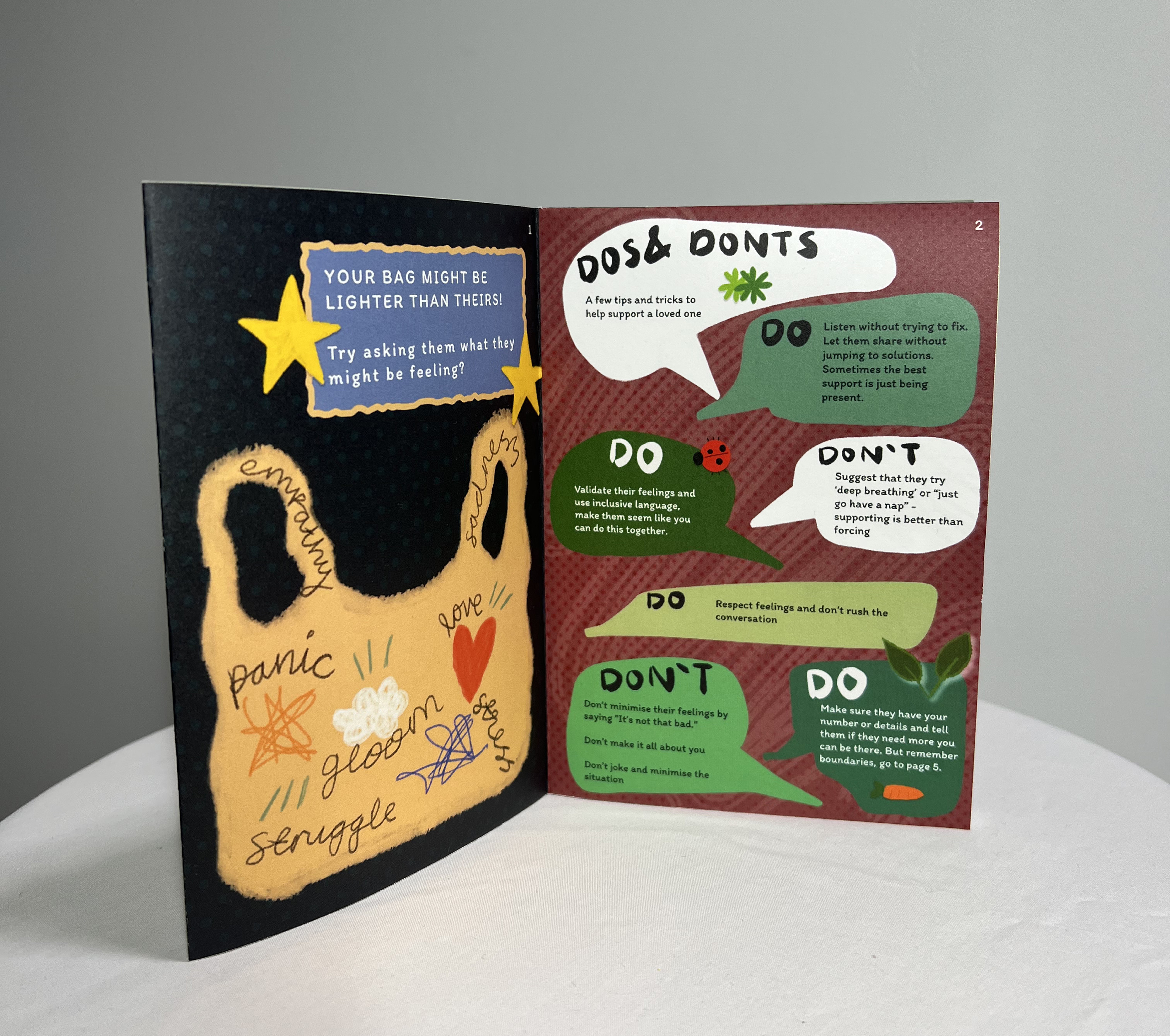 Thorough research informed a series of iterative prototypes and user testing sessions, which ultimately led to the development of illustrated zines and a set of conversation cards.